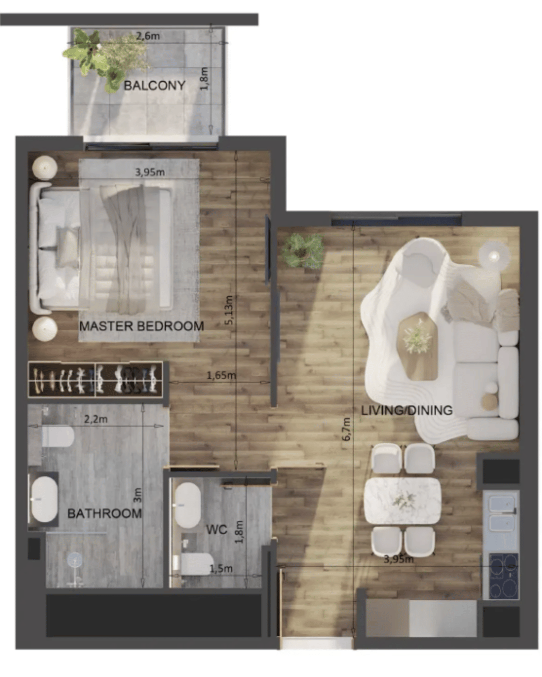 The interiors feature high-quality modern finishes and equipped kitchens, while units are delivered unfurnished, giving residents the freedom to personalize their spaces.